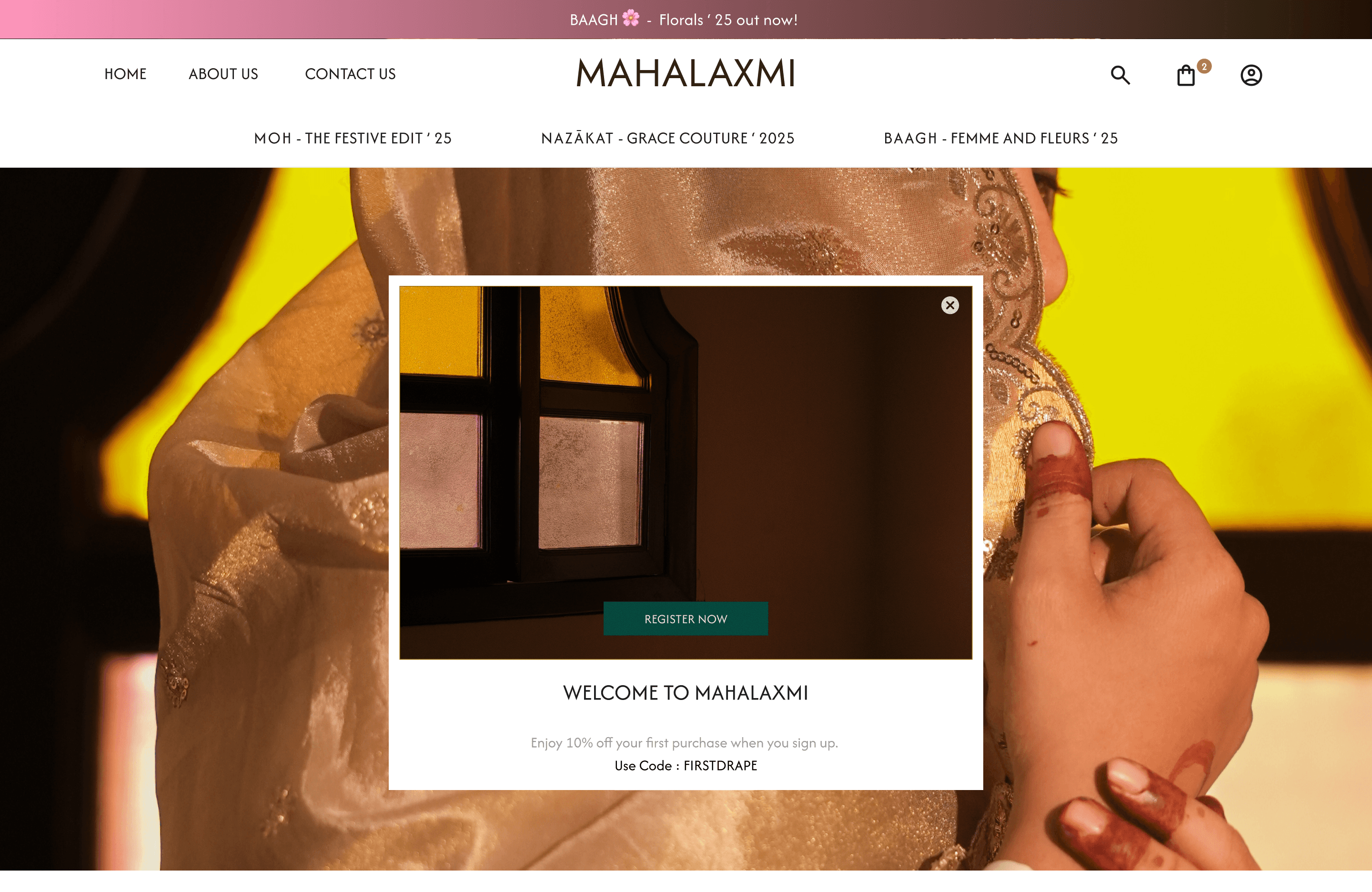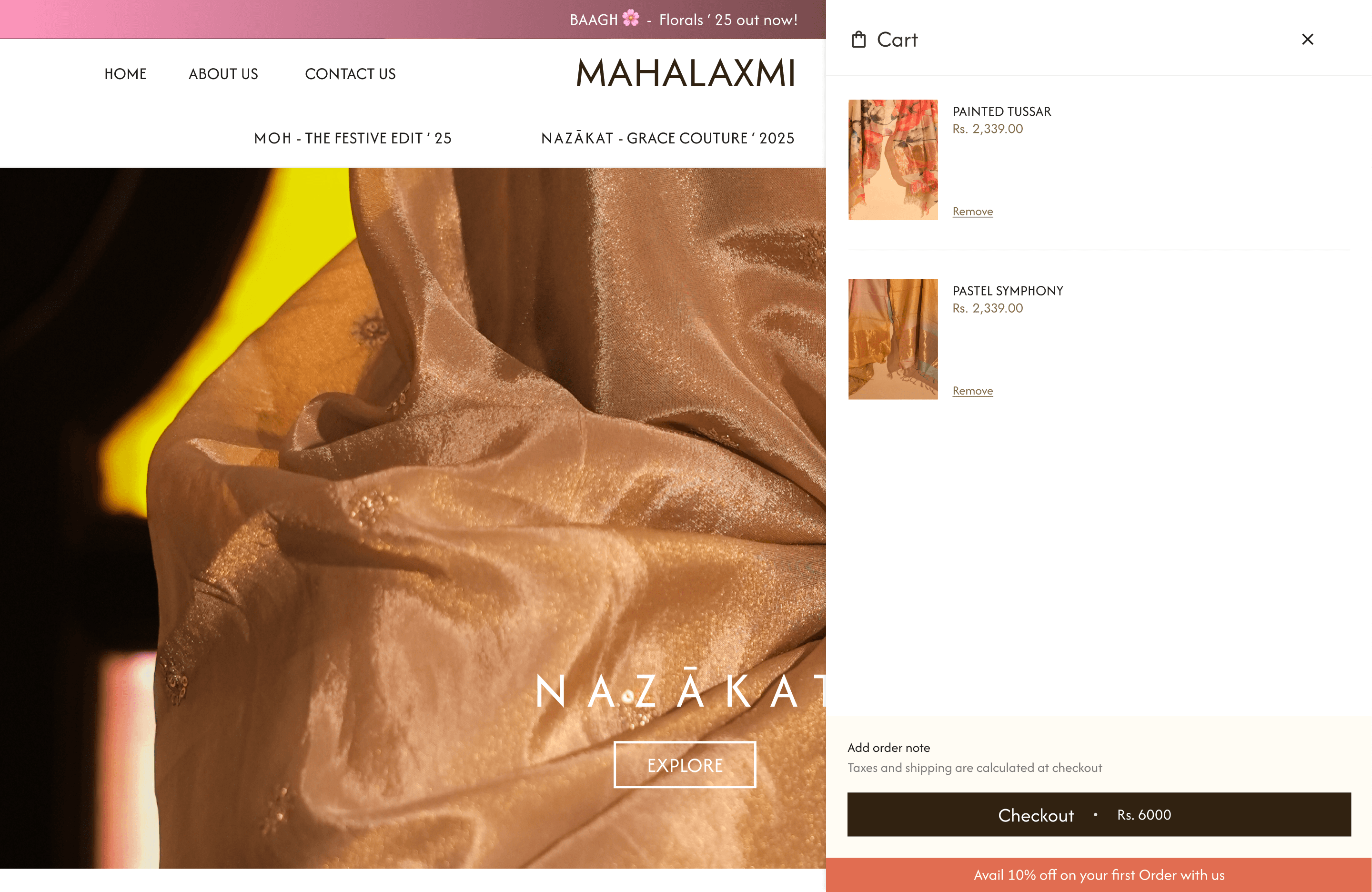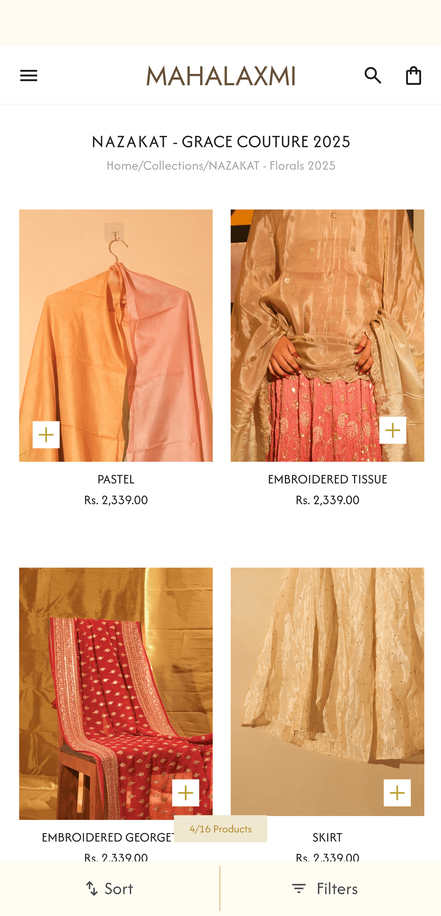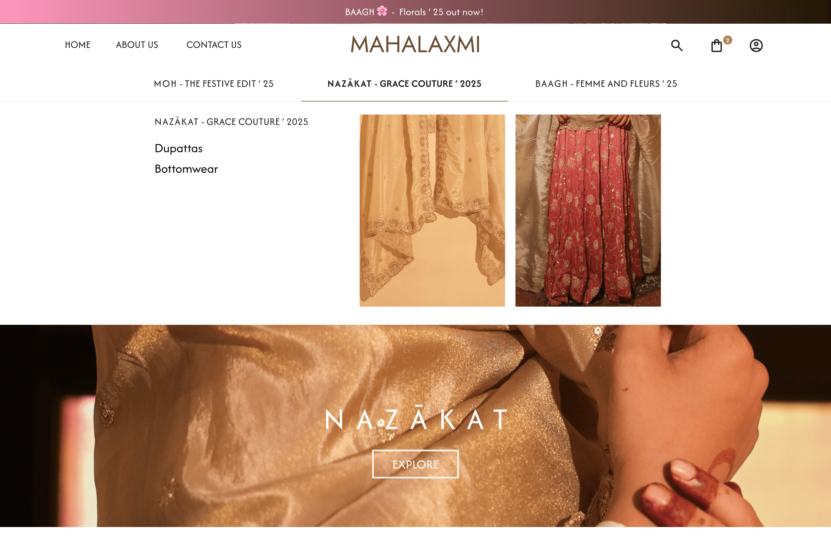 The catalogue was designed around the inventory's reality — limited stock across three curated collections: Nazakat, MOH, and Baagh. Rather than organising by product type (which would've made the selection feel sparse), collections gave the range a sense of intention.
