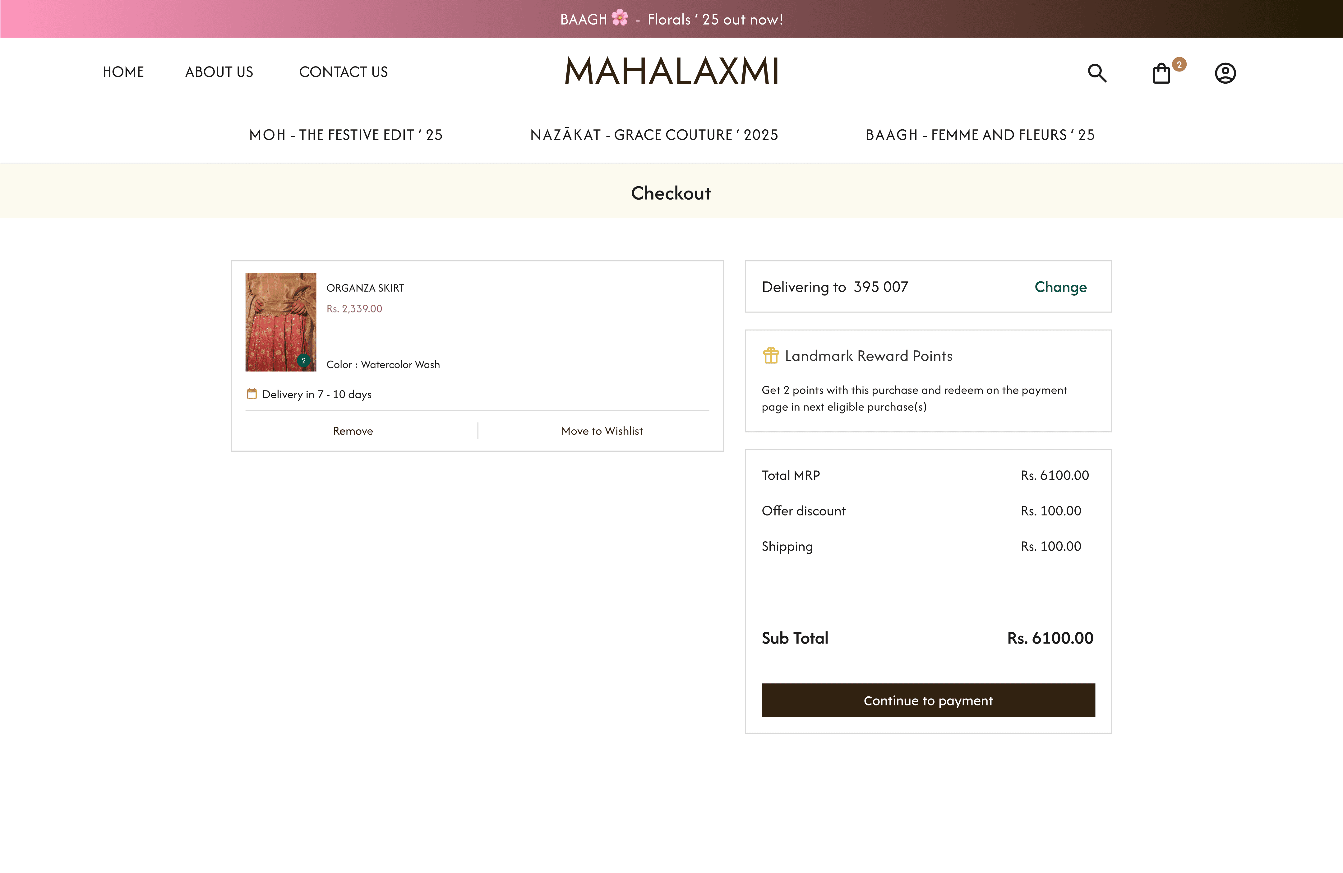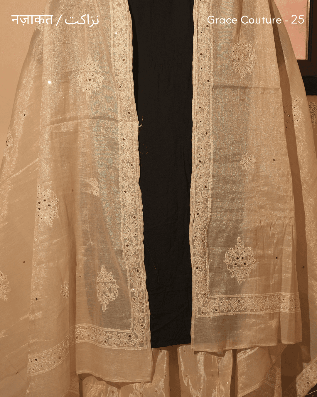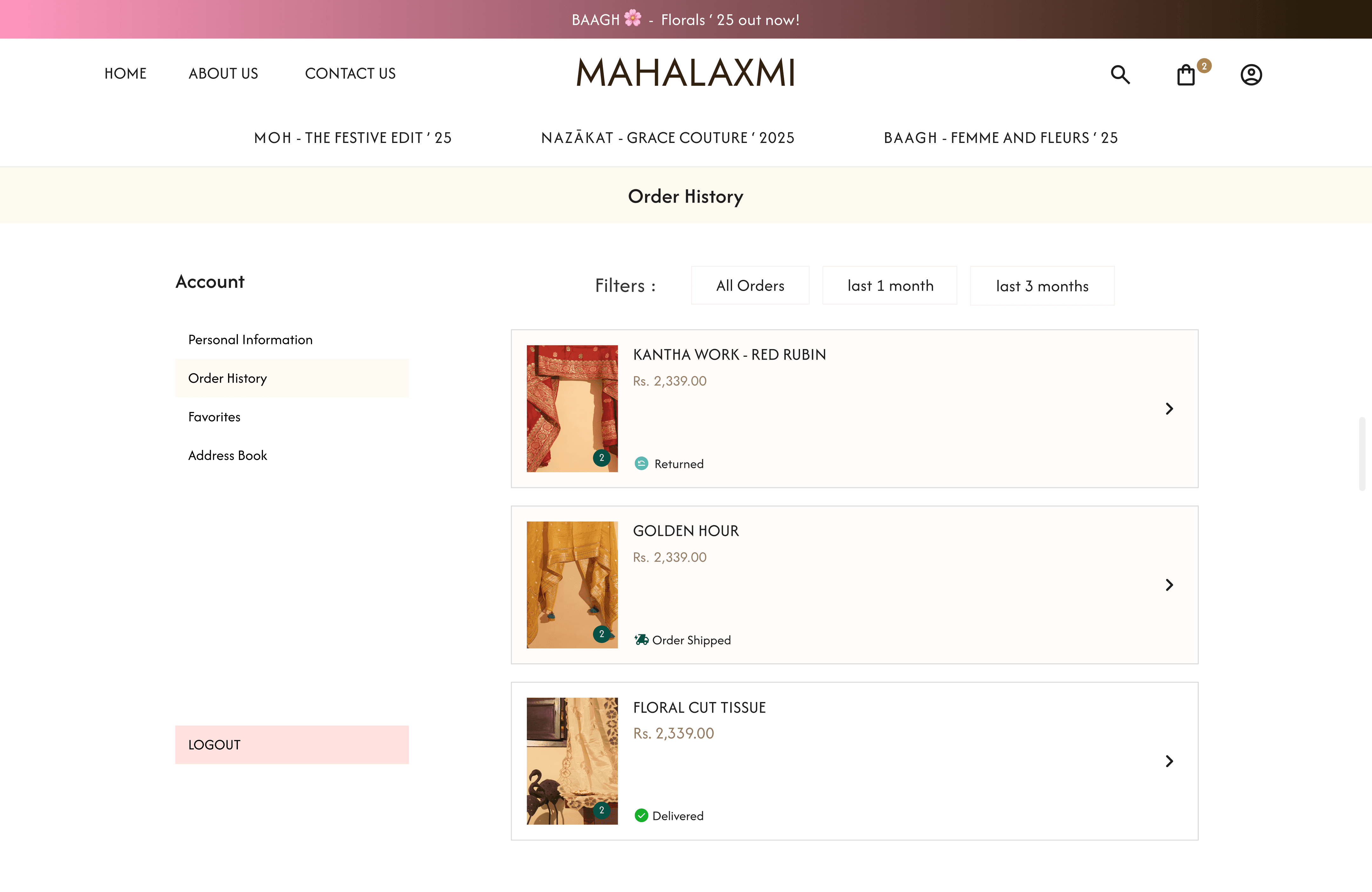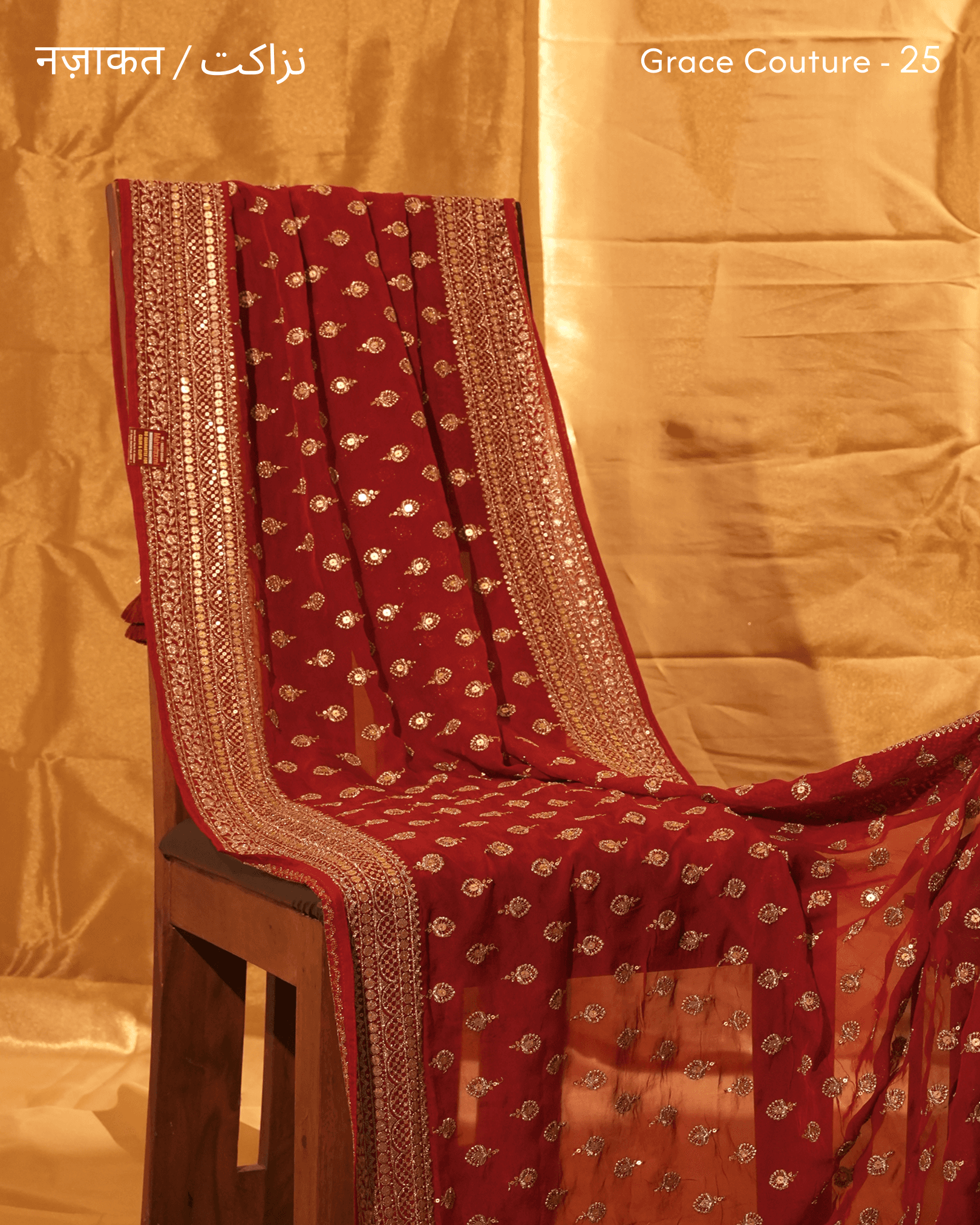 The catalogue was designed around the inventory's reality — limited stock across three curated collections: Nazakat, MOH, and Baagh. Rather than organising by product type (which would've made the selection feel sparse), collections gave the range a sense of intention.